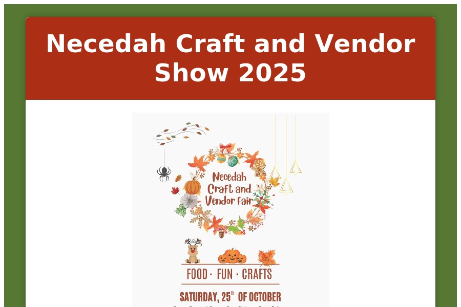 Necedah Craft and Vendor Show 2025 Spots Still Available: First Come First Serve Contact Melissa Dutscheck at 608-565-2256 x112 or email mdutscheck@necedahschools.org